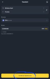 3.-Elige De: Spot → A: Fondos, elige la moneda ej. ETH, coloca el monto y presiona en Transferir.